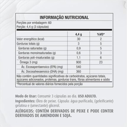 Ingredientes Óleo de peixe, gelatina, água purificada, umectante glicerina e antioxidante mistura concentrada de tocoferóis. CONTÉM GLÚTEN. CONTÉM DERIVADOS