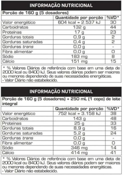 Maltodextrina, Proteína Concentrada do Soro do Leite, Cacau em Pó, Amido Amilopectina (Waxy Maize), Aromatizante e Edulcorante Sucralose. “NÃO CONTÉM GLÚTEN.” “ALÉRGICOS: CONTÉM DERIVADOS DE LEITE E SOJA (LECITINA*).” “CONTÉM LACTOSE.” *Ingrediente usado no processo de instantaneização da proteína do soro do leite.
