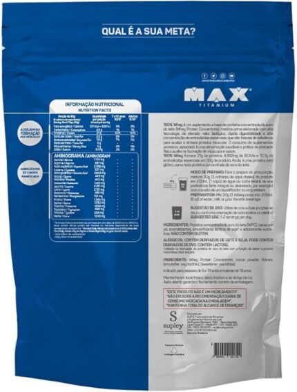 | Nome do produto | 100% Whey Refil (900g) – Cookies and Cream – Max Titanium |