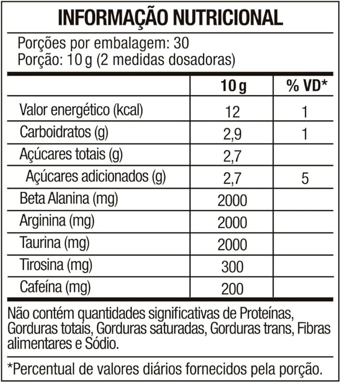 Beta alanina, taurina, isomaltulose (Palatinose ), cafeína, alga chondrus crispus invenal (L-Citrulinilarginina), acidulante ácido cítrico, edulcorantes sucralose e acessulfame potássico e aromatizante artificial black ice. NÃO CONTÉM GLÚTEN.