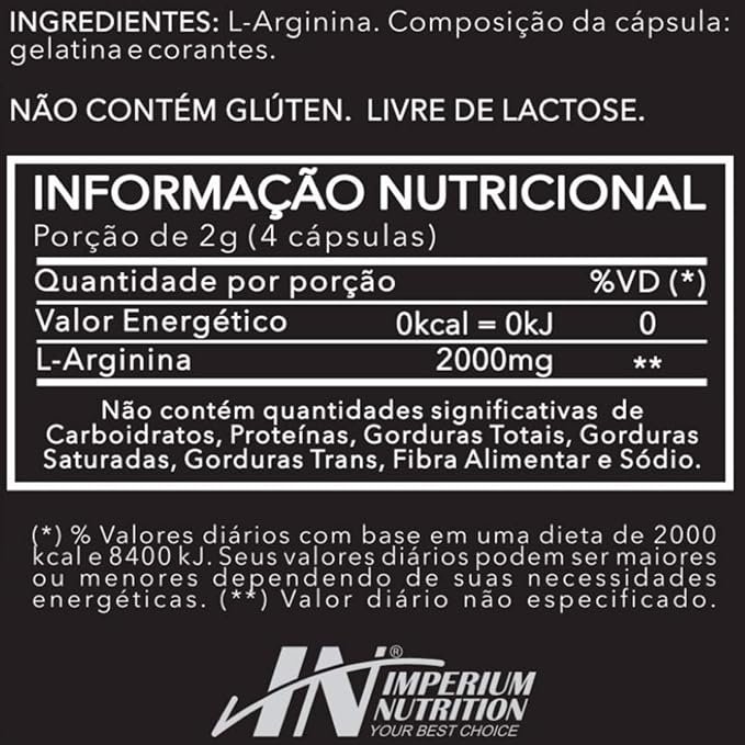IN-ARGININA+ É A ARGININA (120 CÁPSULAS) DA IMPERIUM NUTRITION – FRASCO COM 120 CÁPSULAS DE 600 MILIGRAMAS (PESO BRUTO) E 500 MILIGRAMAS DE PESO LÍQUIDO.