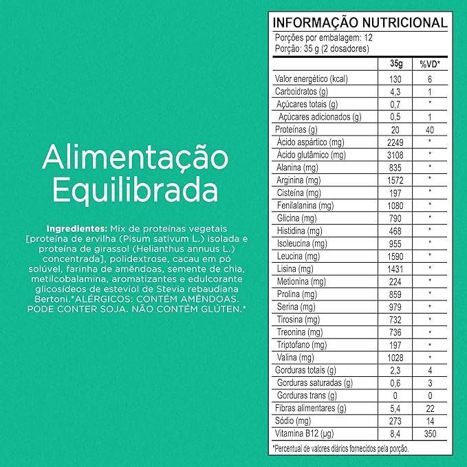 Mix de proteínas vegetais [proteína de ervilha isolada (Pisum sativum L.) e proteína de girassol concentrada (Helianthus annuus L.)], polidextrose, cacau em pó solúvel, farinha de amêndoas, semente de chia, metilcobalamina, aromatizantes e edulcorante glicosídeos de esteviol (estévia). ALÉRGICOS: CONTÉM AMÊNDOAS. NÃO CONTÉM GLÚTEN. Contém aromatizante.