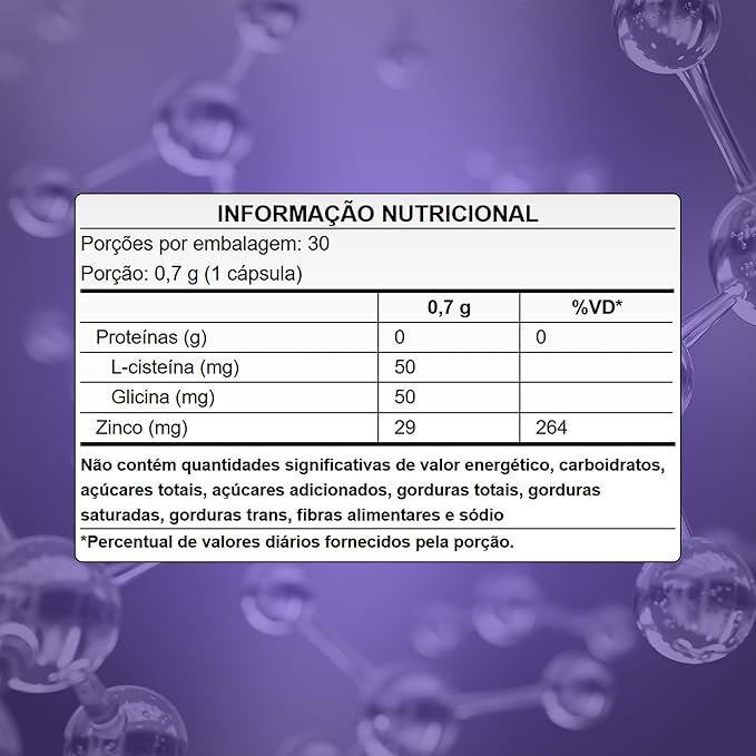 Cápsula (gelatina, água purificada, umectante glicerinae corante natural clorofilina cúprica), óleo de girassol, bisglicinato de zinco, óleo de coco, L-cisteína, glicina, emulsificante lecitina e estabilizante cera de abelha.