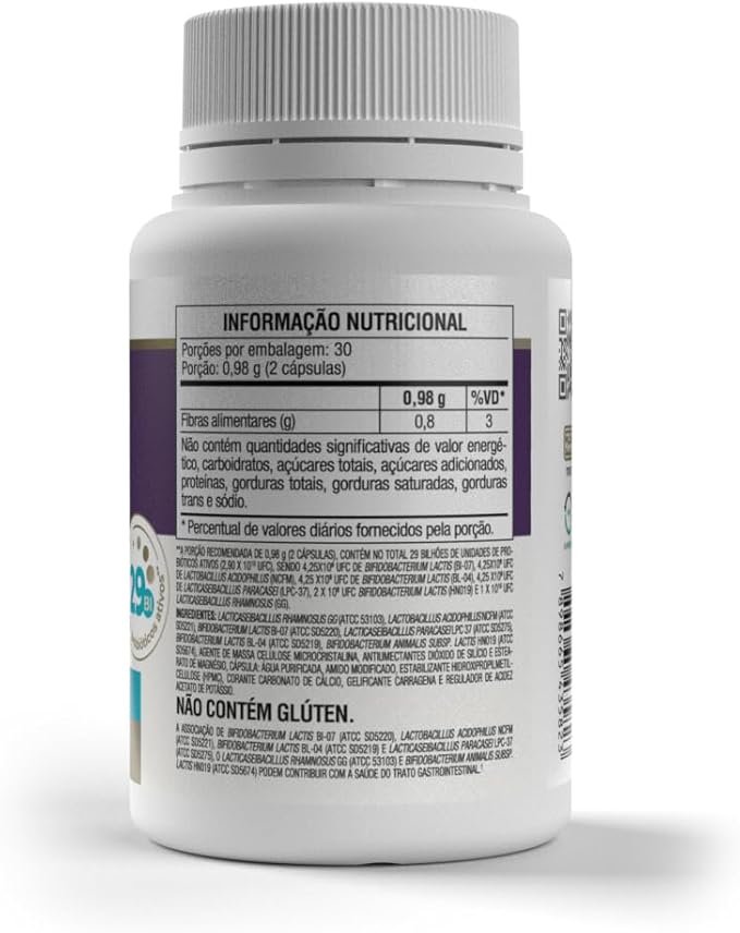 Como consumir? Suplemento alimentar de uso adulto (a partir de 19 anos de idade): ingerir 0,98 g (2 cápsulas) ao dia ou seguir a recomendação de um profissional da saúde. Ingredientes Lacticaseibacillus rhamnosus GG (ATCC 53103), Lactobacillus acidophilus NCFM (ATCCSD5221), Bifidobacterium lactis BI-07 (ATCC SD5220), Lacticaseibacillus paracasei LPC 37 (ATCC SD5275), Bifidobacterium lactis BL-04 (ATCC SD5219), Bifidobacterium HN019 (ATCC SD5674), agente de massa celulose microcristalina, antiumectantes dióxido de silício e estearato de magnésio.