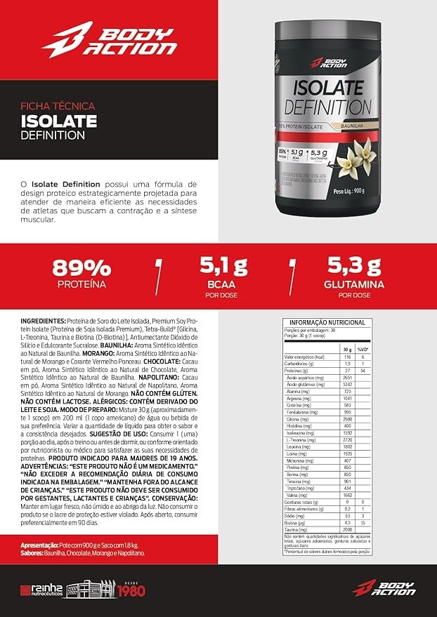 Isolate definition – body action      isolate definition bodyaction é uma das melhores proteínas isoladas na relação custo x benefício do mercado, trazendo uma excelente proposta para aqueles que buscam crescimento muscular sem riscos de acumulo de gordura corporal, ou para aqueles que buscam uma maior definição muscular, aliando baixo custo e qualidade.    formada através do isolamento da proteína do soro do leite por fluxo cruzado (cft ? exchange whey protein isolate) e por soy protein isolate (proteína isolada da soja premium), a isolate definition mantém a pureza da proteína e o seu alto valor biológico, reduzindo os níveis de lactose e gorduras.      isolate definition é rica em aminoácidos essenciais, substratos indispensáveis em diversos processos metabólicos, incluindo uma adequada síntese proteica muscular.     a mistura de whey protein isolada com proteína isolada de soja elabora um produto rico em bcaa (aminoácidos de cadeia ramificada) e glutamina, importantes aminoácidos envolvidos na melhora do sistema imunológico, que agem também como substratos para o fortalecimento das células do intestino e principalmente como recuperadores das células musculares.   benefícios      por ser constituída de 89% de proteínas em sua composição, a isolate bodyaction apresenta 5,1g de bcaa e 5,3g de glutamina por dose, tornando o produto excelente para atletas e praticantes de atividades físicas que necessitam aumentar o aporte proteico diário. entre outros benefícios podemos citar: melhora no ganho de massa muscular; ajuda na definição muscular; alto valor biológico; rápida digestão e absorção; zero gorduras; zero glúten; excelente custo x benefício.   apresentação:     potes com 450g, 900g e 2kg; embalagens stand up pouch 1,8kg.